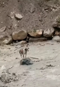 Floods, particularly sudden and severe ones, can wreak havoc on local ecosystems, displacing both people and animals. For the dog trapped in the flood, the danger is clear: the longer it remains on the rock, the higher the risk that it will be swept away or harmed by the debris carried by the water. In such circumstances, animals often find themselves disoriented, scared, and unsure of how to survive, adding to the urgency of the situation.
