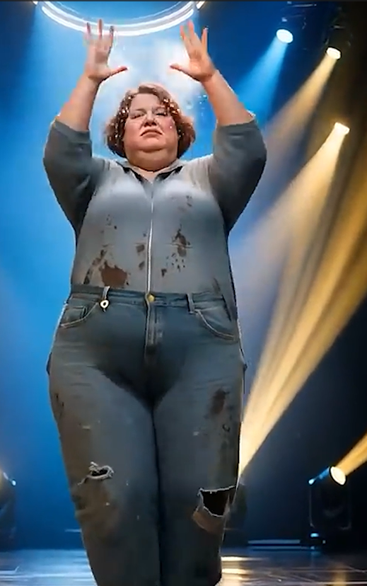 Her hands are raised in an empowering gesture as she steps into the spotlight, despite feeling uncertain. It’s a powerful image, illustrating that confidence doesn’t start with perfection but with a willingness to show up as you are. The messy clothes, the imperfect appearance—they speak to the challenges and fears that many face when starting something new.