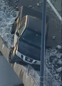 The barrier, damaged as it is, becomes the most important element in the scene. It is the only thing preventing the vehicle from continuing its downward path. What was designed as a protective feature is now serving its purpose in a way that is both visible and critical.