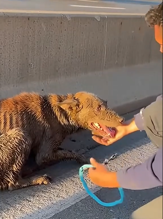 When the hand made contact, the dog did not resist. It allowed itself to be touched, to be held, even in its weakened state. Its mouth opened slightly, its expression soft, as if trying to process what was happening.