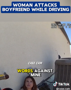 The video begins with officers on the scene, where they find the woman standing outside the vehicle, speaking to law enforcement. The couple had been engaged in a heated argument while driving. According to the body cam footage, the woman was involved in an altercation with her boyfriend, and she allegedly attacked him physically while behind the wheel. The confrontation reportedly took place while they were driving, and it quickly escalated to a dangerous situation.