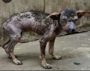 His thin frame revealed prolonged starvation. Each rib, each joint, each fragile limb told a story of days without food, of nights spent cold and unprotected, and of a life without care. His skin, inflamed and damaged, indicated not only disease but also a complete lack of medical attention. This was not a temporary hardship. This was a prolonged state of survival under the harshest conditions.