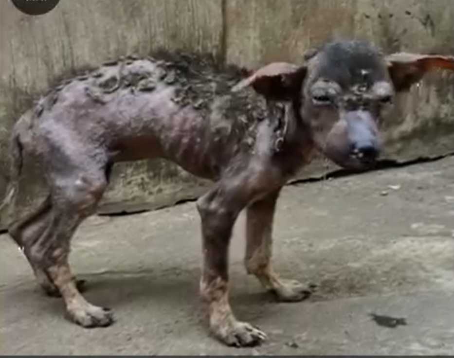 In a forgotten corner of a cold, unforgiving environment, a small dog stood weakly against a worn concrete wall, his body telling a story no living being should ever have to endure. At first glance, it was almost impossible to recognize him as the lively, joyful creature dogs are meant to be. His fur was nearly gone, replaced by patches of raw, damaged skin covered in scabs and infection. His body was painfully thin, his bones sharply outlined beneath what little skin remained intact. Every part of him reflected prolonged suffering, neglect, and isolation.