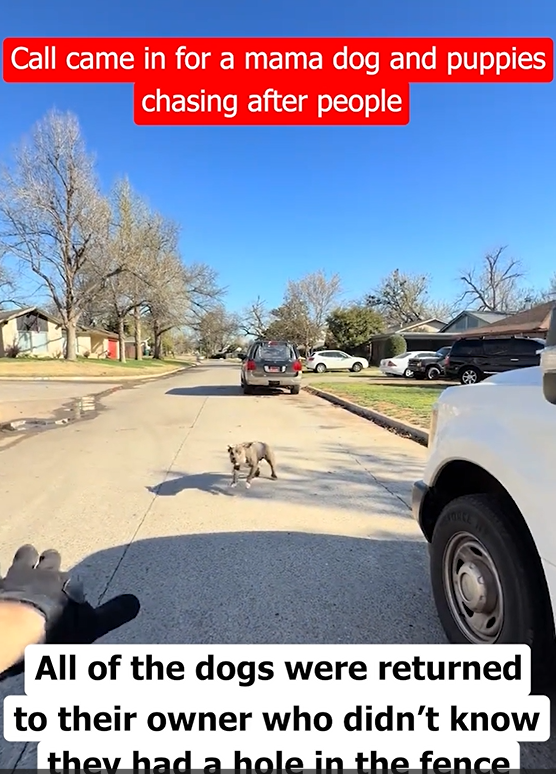 The text overlay explains that a call had come in about a mama dog and her puppies chasing after people. That single line immediately changes how the scene is perceived. What might have seemed like a simple stray dog now carries a sense of urgency and concern. The idea of a mother dog, likely protective and possibly frightened, moving through a neighborhood with her puppies adds layers to the situation. It suggests confusion, instinct, and a need for safety all at once.