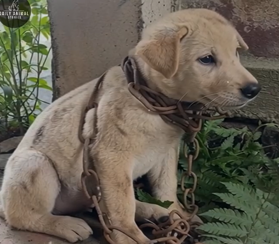 In a quiet corner, beside a rough wall and patches of green, a small puppy sits still. Its body is soft and young, its eyes wide with quiet curiosity—but around its neck, a heavy chain rests like a burden far too large for something so small.