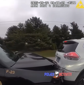 The footage cuts to an exterior angle. The black patrol vehicle marked “F-23” sits behind a white SUV. Suddenly, the SUV shifts backward.
