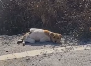 On what appeared to be an ordinary roadside, a quiet and heartbreaking scene unfolded. Lying motionless near the edge of the pavement, a dog rested its head against the ground, its body still and heavy with exhaustion. There were no loud cries, no dramatic movement—just silence.