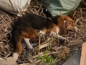 In such a place, hidden among dry grass, scattered debris, and forgotten surroundings, a small dog lies still.