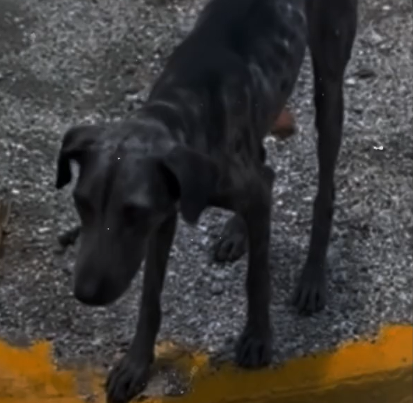 At first glance, the image is quiet—but deeply powerful. A thin, fragile dog stands on rough ground, its body visibly weakened, its posture uncertain. Every bone is outlined beneath its skin, telling a story that words alone cannot fully capture.