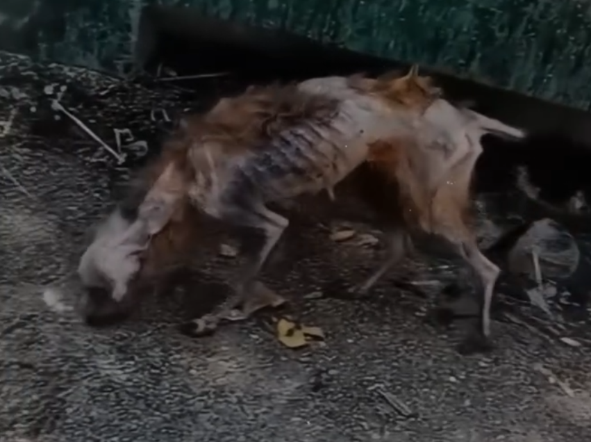 The video opens on a scene that is difficult to watch but impossible to ignore. A dog—so emaciated that every rib, vertebrae, and pelvic bone is visible through a matted, dirt-caked coat—is seen scavenging in a desolate, trash-strewn area. This is the face of extreme hunger. The dog moves with a slow, painful gait, his head hanging low as he searches for even the smallest scrap of discarded food.