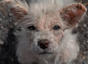 There are moments when a single image says more than pages of words ever could. This is one of those moments. A small puppy, its fur thin and uneven, its skin marked by what appears to be discomfort, looks directly ahead. Its ears stand unevenly, its body fragile, and its eyes carry a depth that feels far beyond its age.