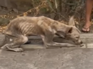 A small, fragile body moves slowly across the ground, each step appearing heavier than it should be. The outline of bones beneath the skin tells a story without needing explanation. It is not just thinness—it is exhaustion, prolonged and deeply rooted.