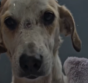 At first glance, it is the eyes that hold your attention. They are large, dark, and deeply expressive, carrying something that goes far beyond curiosity. There is a quiet weight behind them, a stillness that feels almost heavy, as if they have witnessed more than they should have. The dog’s face shows signs of hardship, with uneven fur and marks that hint at a past filled with difficulty. Yet despite everything, there is presence. The dog is alert, aware, and watching.
