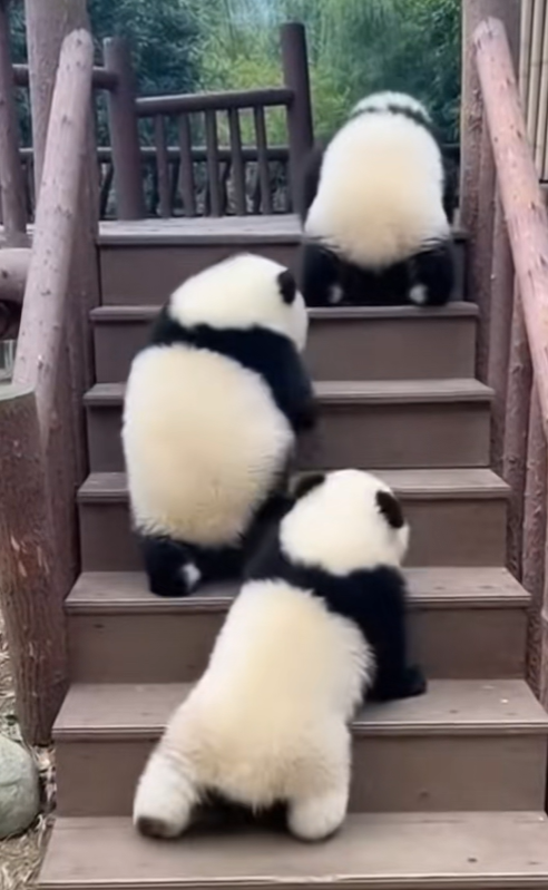 The image of the pandas climbing the stairs can also be seen as a quiet metaphor. Step by step, slowly and sometimes clumsily, they move forward. In many ways, this reflects the journey of their species. Progress has not been fast or easy, but it has been steady. Each small step—each conservation effort, each protected forest, each newborn cub—has helped move pandas further away from extinction.