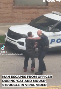 The officer attempts to control the situation, likely following protocol. The man resists, twisting and pulling away, turning what might have been a straightforward detainment into a prolonged struggle. The back-and-forth nature of the encounter is what led many viewers to describe it as a “cat and mouse” chase.