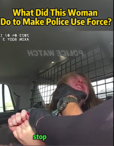 In this case, the fact that the woman is already inside the police vehicle suggests that an initial interaction has already taken place. She may have been detained, questioned, or placed under arrest. The escalation likely occurred when she resisted instructions or behaved in a way that officers interpreted as non-compliant.
