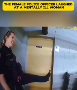 The officer smiles, jokes, and appears entertained by the situation. At one point, she even lifts her leg toward the door in a playful or exaggerated motion—something that, to viewers, felt deeply inappropriate given the circumstances.